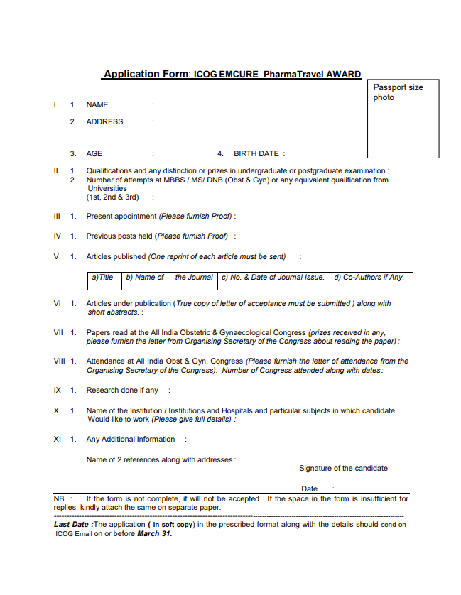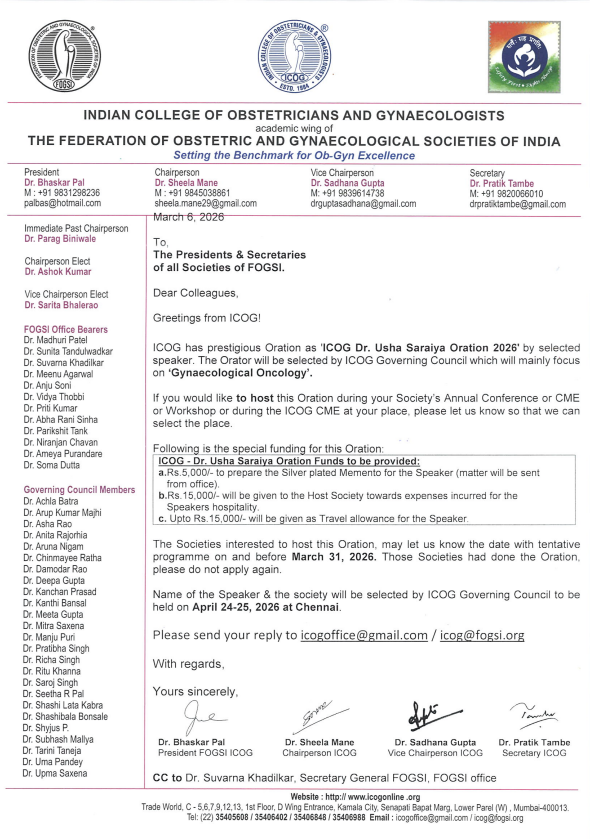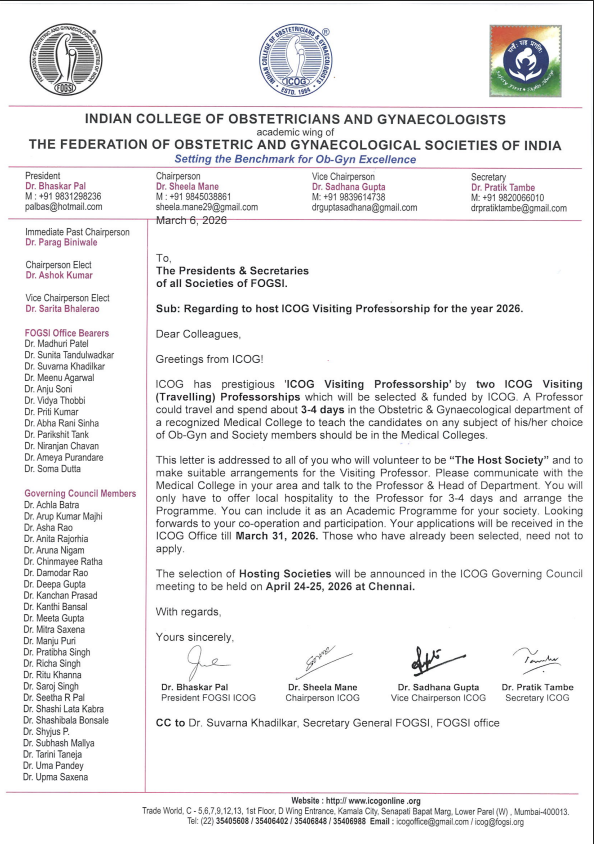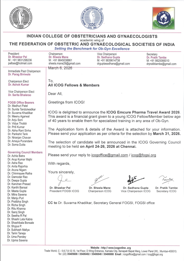 | Application form to attend ICOG Online Centralized Lecture Series in Reproductive Medicine, Endoscopy, Fetal Medicine for (March to June) only to attend for outside Candidates who are Post Graduate Ob-Gyn by paying only Rs 10,000/- Click here for Application Form | ||||