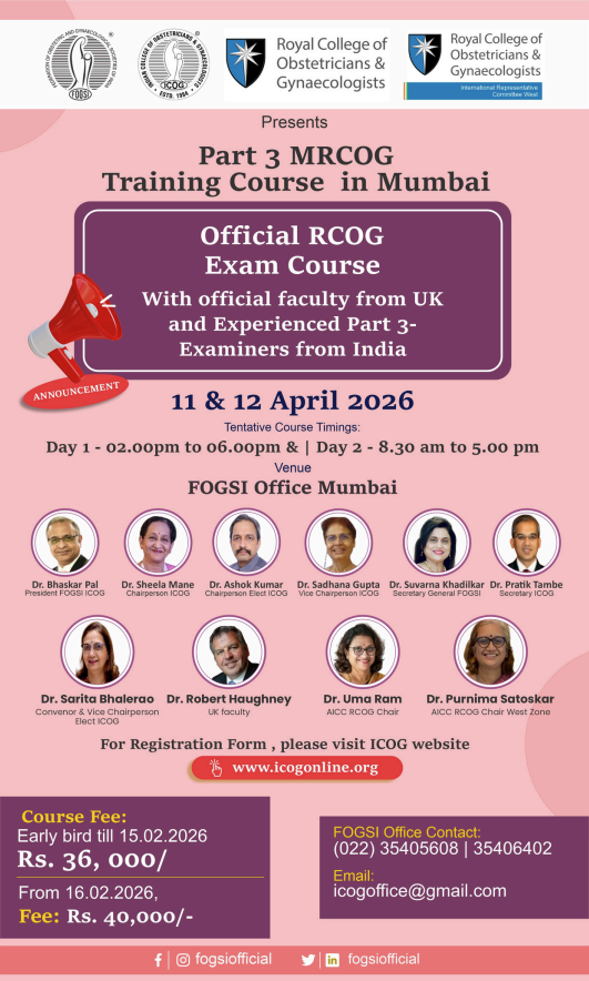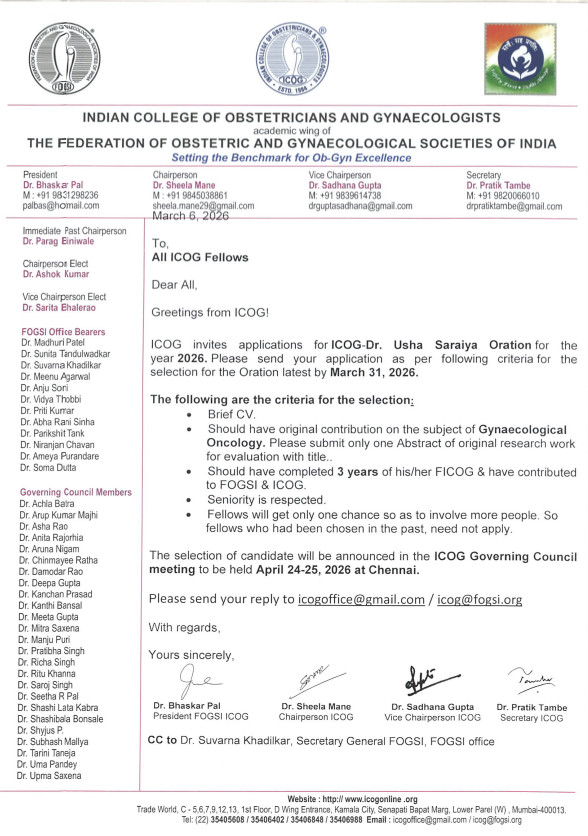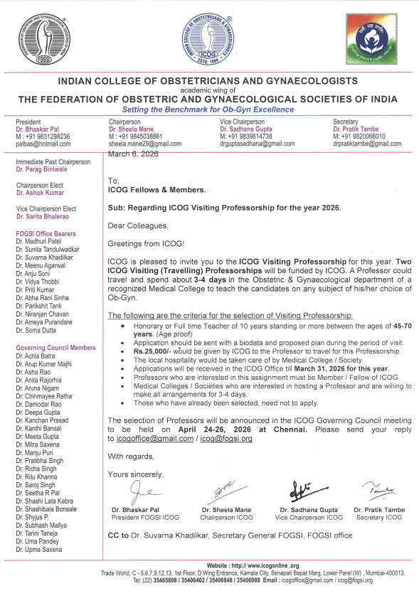 | Application form to attend ICOG Online Centralized Lecture Series in Reproductive Medicine, Endoscopy, Fetal Medicine for (March to June) only to attend for outside Candidates who are Post Graduate Ob-Gyn by paying only Rs 10,000/- Click here for Application Form | ||||